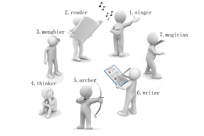 小南有一套可爱的玩具小人,它们各有不同的职业。